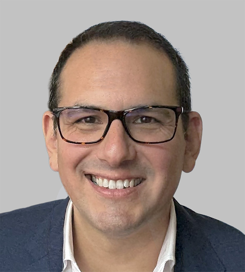 Smiling man with short dark hair and beard wearing a light gray jacket and white shirt against a light gray background.